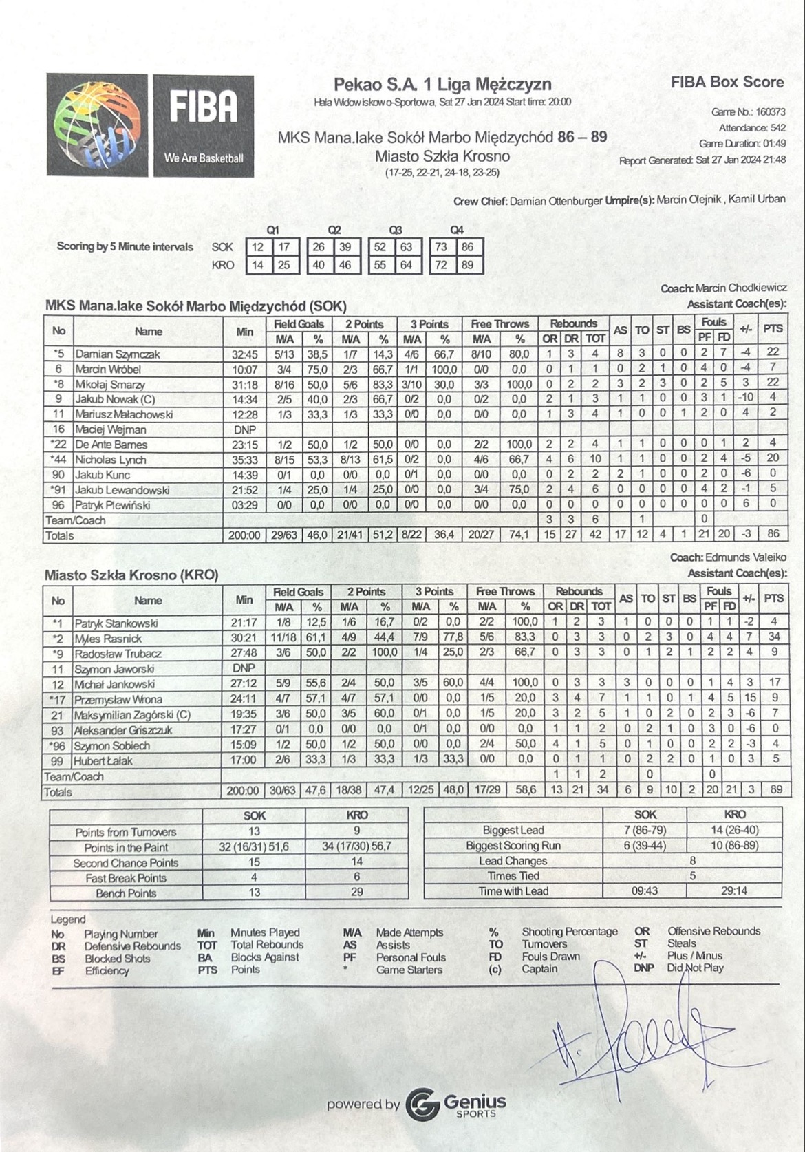 | 5 | Damian Szymczak | 22 | 32:45 | 1/7 | 14.3 | 4/6 | 66.7 | 5/13 | 38.5 | 8/10 | 80.0 | 1 | 3 | 4 | 8 | 2 | 7 | 3 |   |   | 1 | 21 | -4 | |
