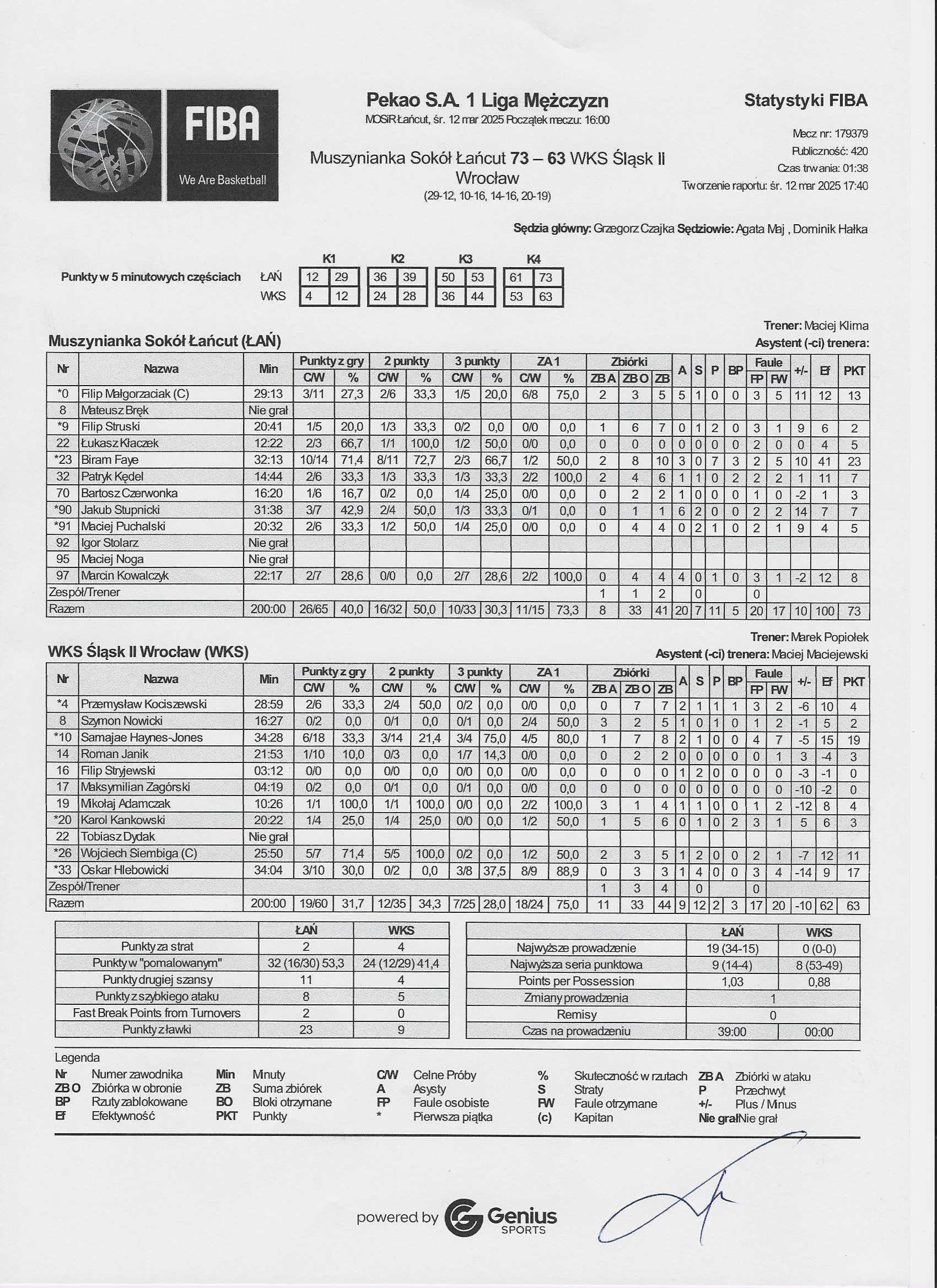 | 26 | Wojciech Siembiga | 11 | 25:50 | 5/5 | 100.0 | 0/2 | 0.0 | 5/7 | 71.4 | 1/2 | 50.0 | 2 | 3 | 5 | 1 | 2 | 1 | 2 |   |   |   | 12 | -7 | |