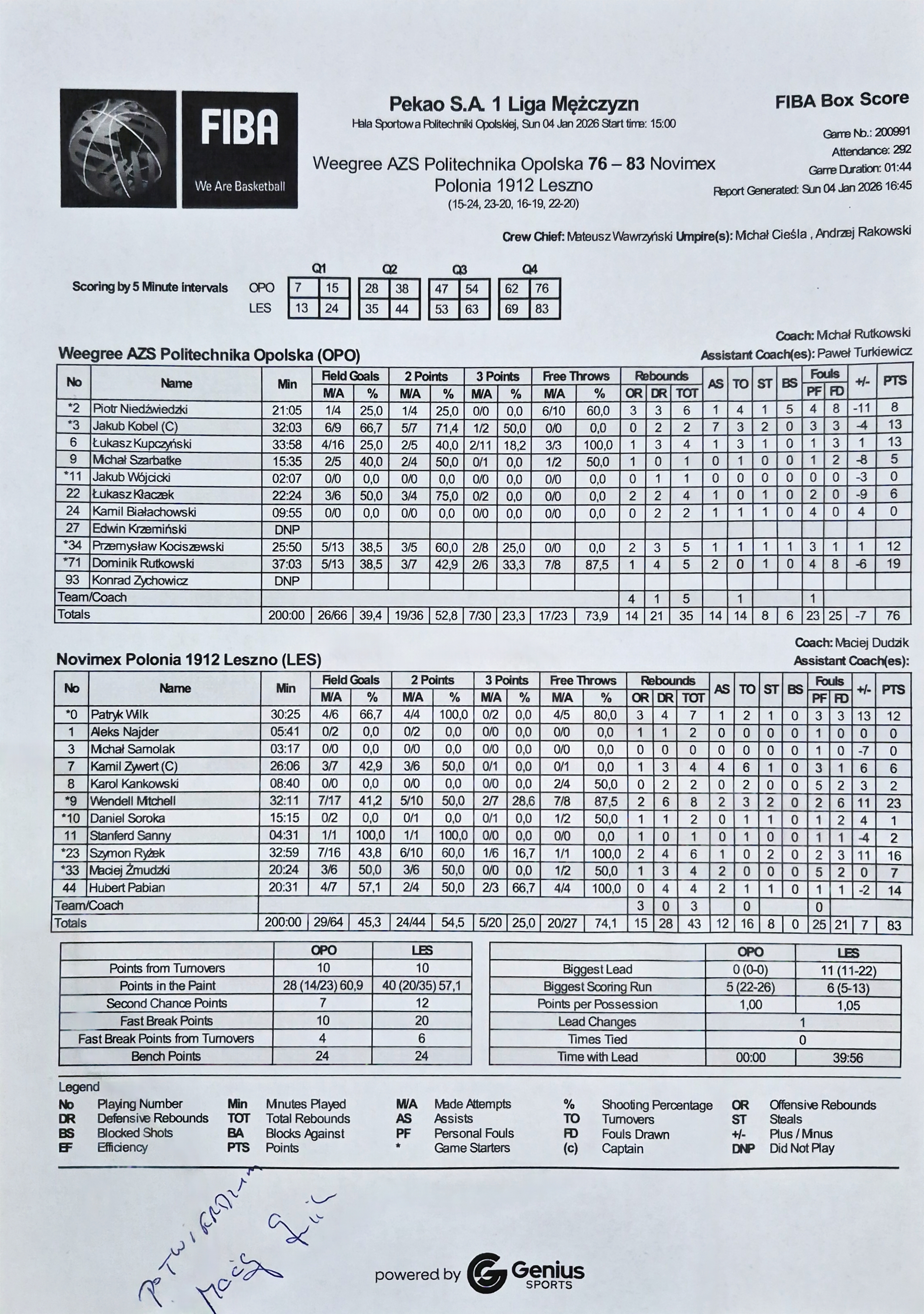 | 44 | Hubert Pabian | 14 | 20:31 | 2/4 | 50.0 | 2/3 | 66.7 | 4/7 | 57.1 | 4/4 | 100.0 |   | 4 | 4 | 2 | 1 | 1 | 1 | 1 |   |   | 17 | -2 | |