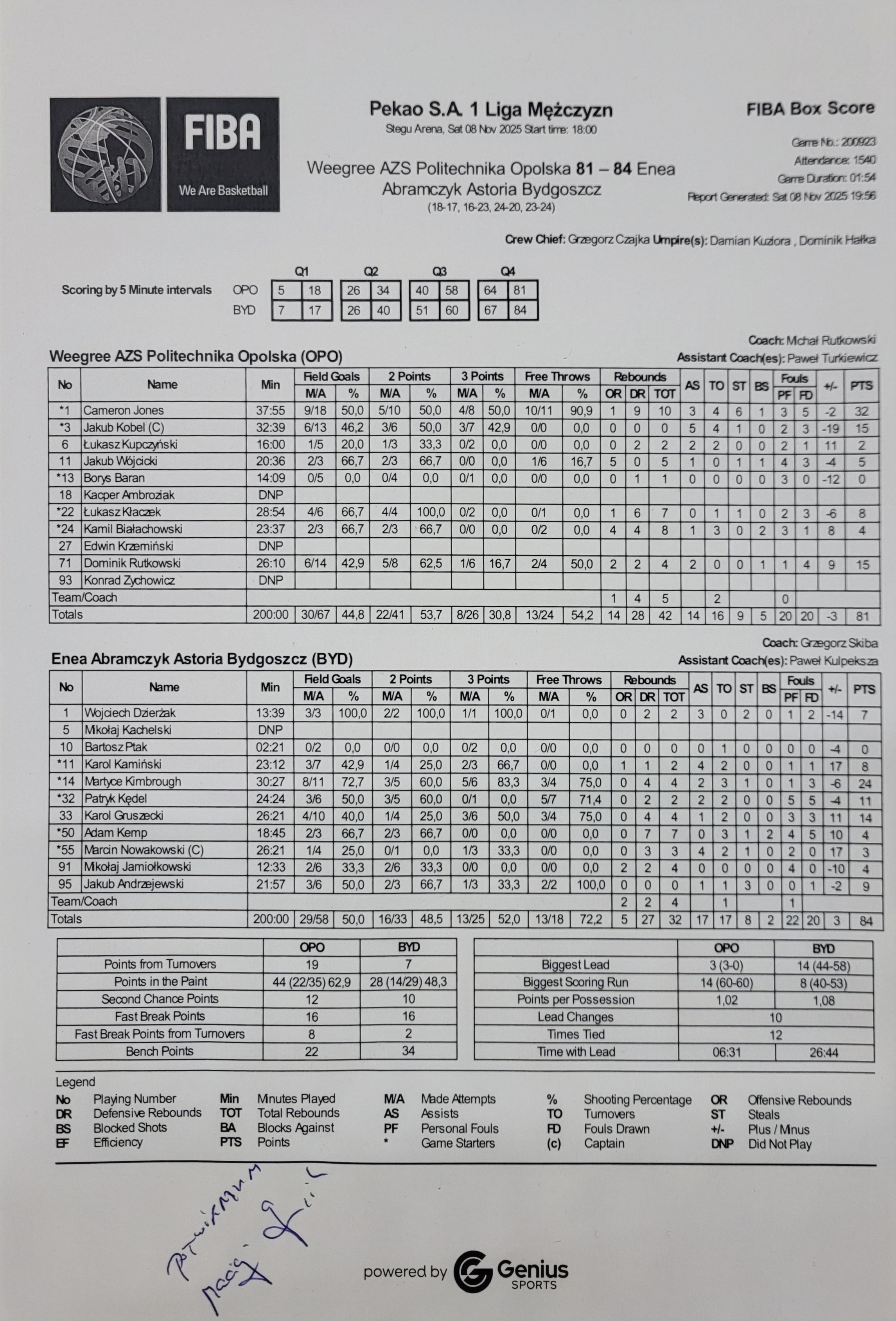 | 32 | Patryk Kędel | 11 | 24:24 | 3/5 | 60.0 | 0/1 | 0.0 | 3/6 | 50.0 | 5/7 | 71.4 |   | 2 | 2 | 2 | 5 | 5 | 2 |   |   |   | 8 | -4 | |