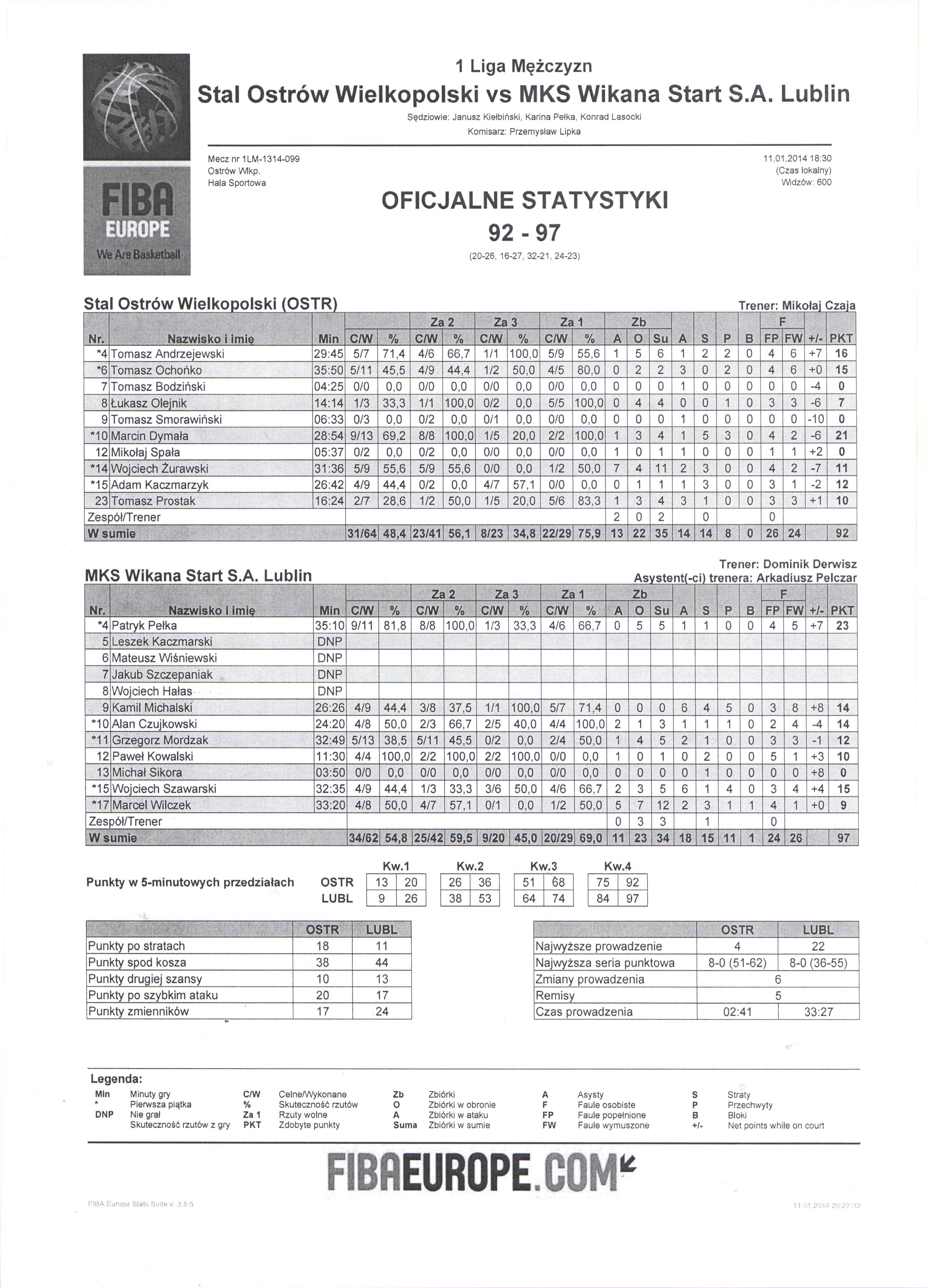 | 10 | Marcin Dymała | 21 | 28:54 | 8/8 | 100.0 | 1/5 | 20.0 | 9/13 | 69.2 | 2/2 | 100.0 | 1 | 3 | 4 | 1 | 4 | 2 | 5 | 3 |   |   | 20 | -6 | |